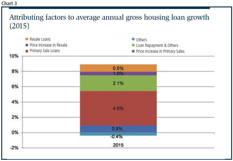 What this shows is that if house prices increase by an unalarming 3%, loan growth is still manageable. As mentioned earlier, since we are assuming there is no principal repayment of the existing loans in the system, the new loan growth of 4% is conservative. The estimated 9,686 units that can be accommodated by the additional loans are about 95% of the approximately 10,200 new sales transacted in 2015. Unfortunately, although prices can be afforded a raise, the supply of new homes will have to be restrained because Chart 3 shows primary sale loans are a major contributor to the increase of housing loans.